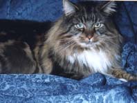 | メインクーンはメインクーン同士!ということで「ぽろ」の第2婦人としてうちで引き取ることになった「たかな」 「たかな」はなぜか前の飼主にいじめられていたらしく、少々性格が曲がってしまったのですが、うちにきて やっとのびのびと暮らせるようになったようです。「たかな」と「ぽろ」の間には数匹の子供が生まれましたが 「みゅー」とちがって「たかな」は自分の子供の面倒をみれない猫でした。したがって大きく育ったのは 「とまと」のみでした。「ぽろ」失踪後、代わりの雄猫の「うり」がもらわれてきたので「たかな」は、また第2婦人 として「うり」の子供を宿しました。 |