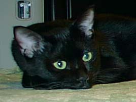毛布の外でも平気そうに見えるけど 実はストーブの前。 実はストーブの奴に恋してるんだけど スリスリしすぎてよく尻尾なんかが こげちゃうんだ。 |