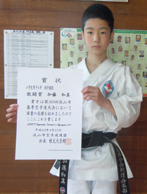 2012/0415流山市総合体育館にて開催されました第30回流山市春季空手道大会に於いて田澤苺加選手は小学生1・2年女子組手の部で敢闘賞、加藤和真選手は小学生6年男子組手の部で敢闘賞、橋本尚弥選手は中学生1年男子組手の部で第3位と大活躍でした。