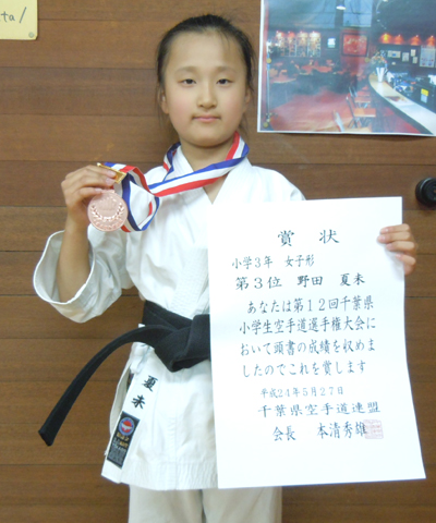 2011/0529/千葉県武道館にて開催されました第11回千葉県小学生空手道選手権大会に於いて野田夏末選手が小学2年女子形の部で準優勝、小学2年女子組手の部で敢闘賞、桑野寛太選手が小学4年男子形の部で第3位、今野優華選手が小学4年女子組手の部で敢闘賞、野田一樹選手が小学6年男子形の部で敢闘賞と大活躍でした。