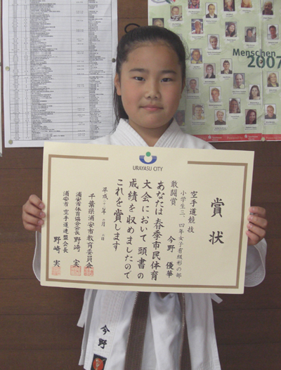 2010/0606/浦安市立総合体育館にて開催されました平成22年度浦安市民体育大会空手道競技に於いて、中学生女子組手の部で今野玲華選手が敢闘賞、小学生3・4年女子有級形の部で今野優華選手が敢闘賞と大活躍でした。