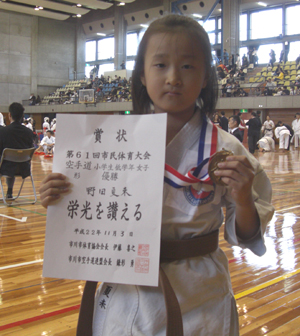2010/1103 国府台市民体育館にて開催された市川市民体育大会空手道競技に於いて、今野玲華選手は中学生女子組手の部で優勝2連覇、形の部では藤崎はづき選手が第3位、原田渉平選手は中学2・3年男子組手の部で優勝、形の部でも準優勝、野田一樹選手は小学生高学年男子形の部で準優勝、桑野寛太選手は小学生中学年男子形の部で優勝、野田夏末選手は小学生低学年女子形の部で優勝と大活躍でした。