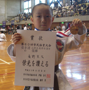 2010/0801/東京武道館にて開催されました第48回関東地区選手権大会に於いて小学生3年男子形の部で桑野寛太選手が優勝と大活躍でした。