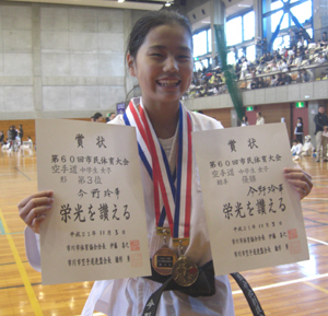 小学生高学年女子組手の部で第3位、形の部も敢闘賞の今野玲華選手!!