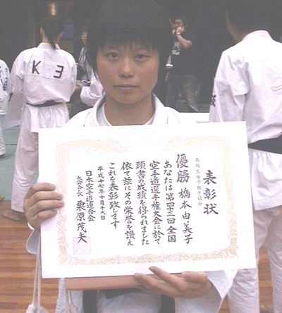 051016 大阪府立体育館第一競技場にて開催された日本空手道連合会第43回全国空手道選手権大会に於いて高校生女子組手の部で橋本由美子選手が優勝!!大活躍でした。
