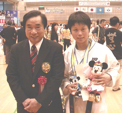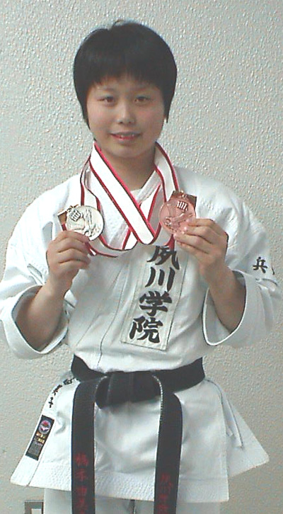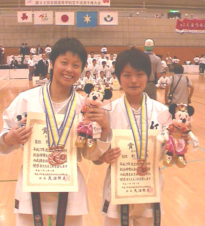 050803〜0805までの間浦安市総合体育館にて開催された平成17年度全国高等学校総合体育大会空手道大会、第32回全国高等学校空手道選手権大会に於いて兵庫県代表夙川学院高等学校3年橋本由美子選手は女子個人組手競技及び団体組手競技に於いてそれぞれ第3位、千葉県代表拓殖大学紅陵高校3年松谷知美選手は女子個人形競技に於いて第3位と両名とも優勝まで後一歩のところでしたが思う存分力を発揮いたしました。両名とも春の選抜大会に続き平成17年度空手道競技全日本高校代表選手に認定されました。今後ますますの健闘を期待いたします。