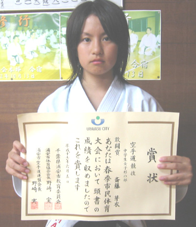 050710荒川区総合スポーツセンターにて開催された日本空手道連合会第43回東日本空手道選手権大会に於いて制護会の柿木未来選手が中学女子形の部で準優勝と大活躍!!尚、平成17年10月16日大阪府立体育館にて開催される第43回全国空手道選手権大会の出場を決めました、健闘を期待致します。