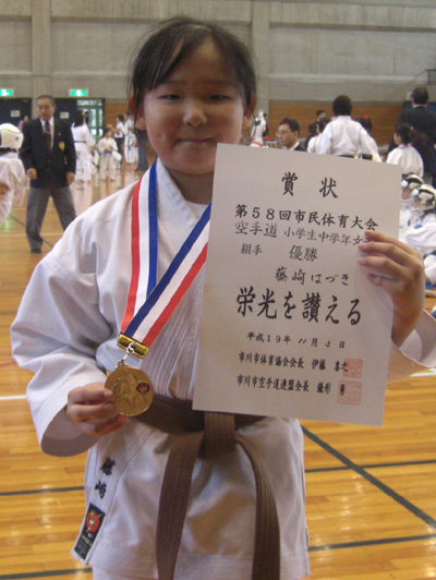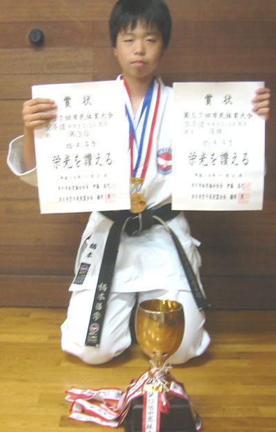 061103 市川市国府台市民体育館に於いて開催された、第57回市川市民体育大会空手道競技で制護会またまた大活躍!一般有段男子組手の部で安田昇司選手が優勝、一般女子形の部で柿木未来選手が優勝、一般女子組手の部で須藤里紗選手が第3位、一般有級男子形の部で谷島秀一選手が準優勝、高校生男子組手の部で入江和行選手が準優勝、形の部でも第3位、多田学人選手も組手の部で第3位、中学生2・3年男子組手の部で優勝、形の部でも第3位、中学生1年男子形の部で優勝、桑野恒太選手は第3位、清水新士選手も第3位、小学生高学年男子形の部で多田颯人選手が第3位、桑野丈志選手は敢闘賞、組手の部でも多田颯人選手が敢闘賞、網守晃次郎選手、中澤佳祐選手も敢闘賞、小学生中学年女子組手の部で今野玲華選手が準優勝、荒木梨沙選手は第3位、藤崎はづき選手は敢闘賞、形の部でも今野玲華選手、山田由加選手、藤崎はづき選手とも敢闘賞、小学生低学年男子組手の部で齋藤元希選手が準優勝、熊谷 淳選手は敢闘賞、形の部でも齋藤元希選手、井上慶亮選手が敢闘賞、小学生低学年女子組手の部で赤松亜沙美選手が敢闘賞と大活躍でした!!