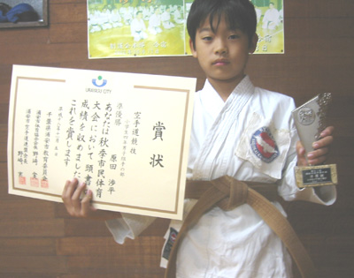 061105 浦安市立総合体育館で開催された浦安市制25周年記念大会秋季空手道競技に於いて市川大会に続き制護会大活躍!!一般女子形の部で柿木未来選手が先日の市川大会に続き優勝!!原田遼平選手が中学生1年生男子組手の部で敢闘賞、小学生4年男子組手の部で原田渉平選手が準優勝、今野玲華選手が小学生3・4年女子組手の部で第3位と大活躍でした!!