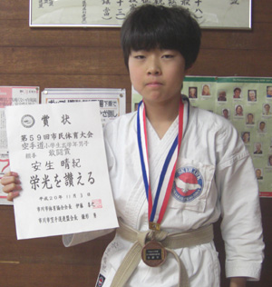 小学生高学年男子組手の部で敢闘賞の安生晴紀選手!!