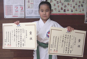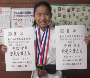 080518 千葉県総合運動場内武道館にて開催された第8回千葉県小学生空手道選手権大会に於いて6年生女子組手の部で今野玲華選手が敢闘賞と活躍しました。