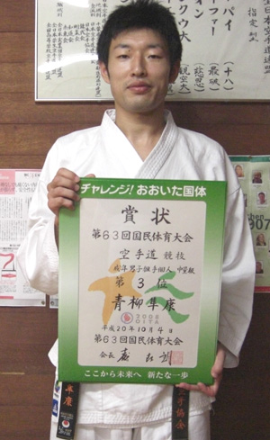 081004-06 大分県中津市で開催された第63回国民体育大会に於いて青柳隼康選手が成年男子組手個人戦中量級で第3位と大活躍でした。