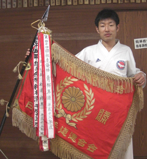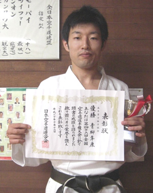 081012 大阪府立体育館にて開催されました日本空手道連合会の全国空手道選手権大会に於いて成年男子組手の部で青柳隼康選手が優勝!!