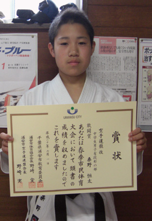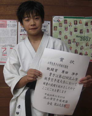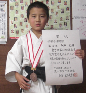 081123 流山市体育館にて開催された第42回秋季流山市空手道大会に於いて安田昇司選手が一般有段組手の部で第3位、佐藤 亮選手は一般有段形の部で第3位,橋本昌季選手は高校生男子形の部で第3位、高田蒔夫選手は高校生男子組手の部で敢闘賞、桑野恒太選手は中学生男子形の部で第3位、今野玲華選手は小学生5・6年女子組手の部で第3位、原田渉平選手は小学生6年男子組手の部で敢闘賞、今野元輝選手は小学生4年男子組手の部で第3位、今野優華選手は小学生1・2年女子組手の部で敢闘賞、と大活躍でした。