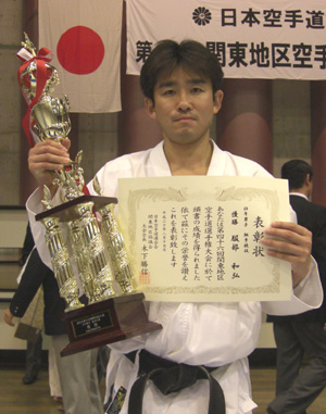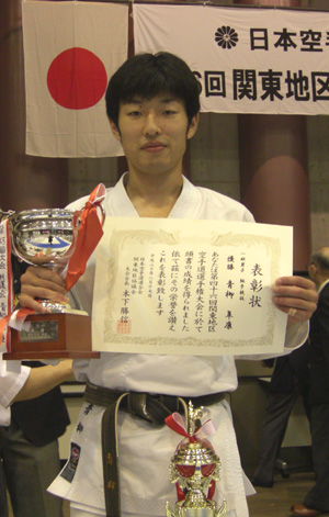 080420 流山市体育館にて開催された第26回流山市空手道大会に於いて一般有段組手の部で安田昇司選手が優勝、澤居正章選手が敢闘賞、一般有段形の部で佐藤 亮選手が敢闘賞と活躍しました。