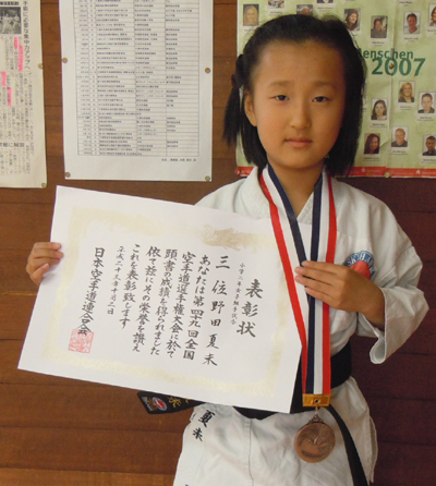 2011/1002/大阪府立体育館にて開催されました第49回全国空手道選手権大会に於いて野田夏末選手が小学2年女子組手の部で第3位と大活躍でした。
