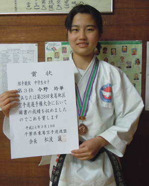 2012/0318/流山市総合体育館にて開催されました第28回東葛地区空手道選手権大会に於いて藤田ゆき選手が小学1・2年生男女形の部で敢闘賞、今野優華選手は小学3・4年生女子組手の部で敢闘賞、加藤和真選手は小学5・6年男子組手部で優勝、橋本尚弥選手は小学生有段者男女形の部で第3位、小学5・6年男子組手の部でも敢闘賞、山口 真選手も小学生有段者男女形の部で敢闘賞、今野玲華選手は中学生女子組手の部で第3位、佐藤 亮選手は一般有段形の部で優勝と大活躍でした。