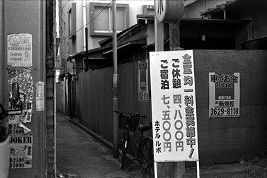 組写真「この町で僕は育った」五枚目です。これも四枚目同様の狙いがあります。メインはもちろん、ちょっとあやしい看板ですが、その裏にある家々や自転車、左奥に伸びる路地も、いい被写体になっています。