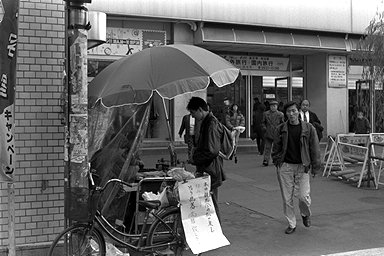 組写真「この町で僕は育った」八枚目です。これも同じく競馬開催日の日曜日に撮影しました。駅前に立つ小さな予想屋さんと、そこの店主のおじさんの言葉に熱心に耳を傾ける男性が、この写真のメインです。