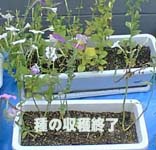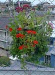 7月初めにペチュニアの苗が余って ハンギングバスケットを作ってみた。 しかしバスケットを覆うどころか ペチュニアはどんどん1本草のように 上へ伸びてしまい、とても醜く育つ。 一緒にバーベナを植えてみたが、 こちらは夏の暑い日差しに1週間後 すべてドライフラワーと化してしまった。 うう-ん時期を誤ってしまったみたい。 しかも西側のフェンスにかけたせいか すぐさまご臨終になった。