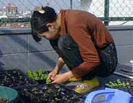 数種類の種をまく。すると芽が出るわ出るわ、本を参考に苗をひとつづつ植え替える作業。