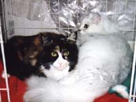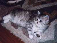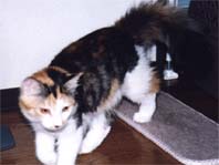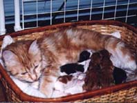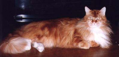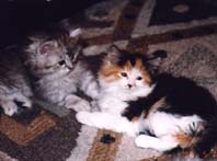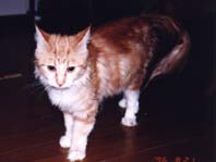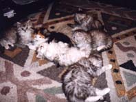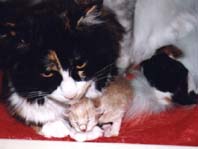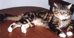 | メインクーンはメインクーン同士!ということで「ぽろ」の第2婦人としてうちで引き取ることになった「たかな」 「たかな」はなぜか前の飼主にいじめられていたらしく、少々性格が曲がってしまったのですが、うちにきて やっとのびのびと暮らせるようになったようです。「たかな」と「ぽろ」の間には数匹の子供が生まれましたが 「みゅー」とちがって「たかな」は自分の子供の面倒をみれない猫でした。したがって大きく育ったのは 「とまと」のみでした。「ぽろ」失踪後、代わりの雄猫の「うり」がもらわれてきたので「たかな」は、また第2婦人 として「うり」の子供を宿しました。 |
