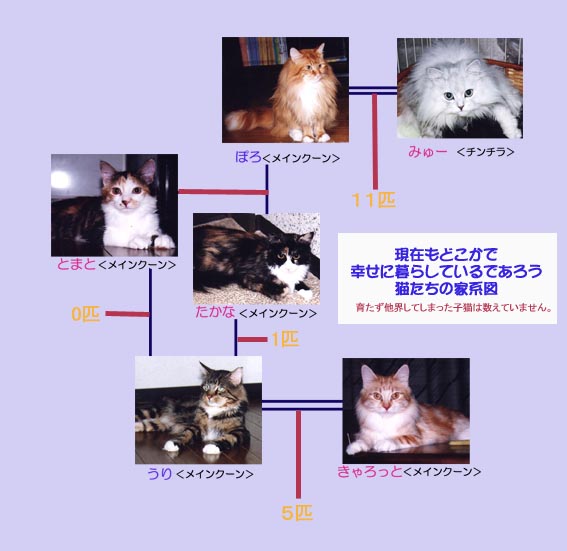 | かつて、私の家には沢山の猫がいました。猫たちはまた子猫を産み、やがて友人及びブリーダー経由で 各地方の優しい家庭で幸せに暮らしているでしょう。もしかして、あなたの家の猫は、うちが「ふるさと」なのかも・・・・。 これらの猫たちを、写真を添えてまとめてみました。 「ぽろ」 <メインクーン♂> 「みゅー」 <チンチラ♀> ぽろ&みゅーの子供達 「たかな」 <メインクーン♀> 「とまと」 <メインクーン♀>・・・ぽろ&たかなの子供 「うり」 <メインクーン♂> 「きゃろっと」 <メインクーン♀> うり&きゃろっとの子供 うり&たかなの子供 うり&とまとの子供 |