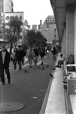 組写真「この町で僕は育った」六枚目です。これは僕の家の、最寄り駅での風景です。メインは右側に座り込む人。その周りをハトが歩き、左側には座り込む人を少しよけるようにして、人々が歩いていきます。