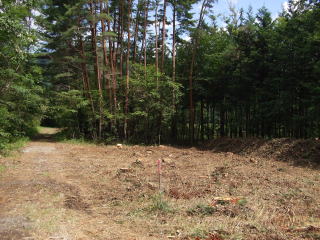 北側舗装市道に間口が面す。道路より1mくらい高い。西側に南アルプスを望む。別荘地やプライベートキャンプ場に適す。要伐採。