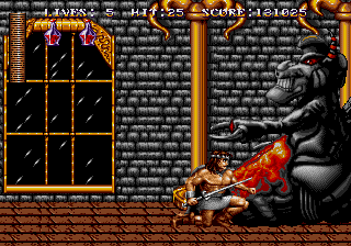 で、右方向にすすんでいくと、3面では挨拶しに来ただけ だった怪物がまちかまえています。 こいつは、離れていると上の画像の様に弾を撃ちます。 (もちろんジャンプでは回避不可な速度で) また接近戦では腕を伸ばしてパンチしてくれます。 |